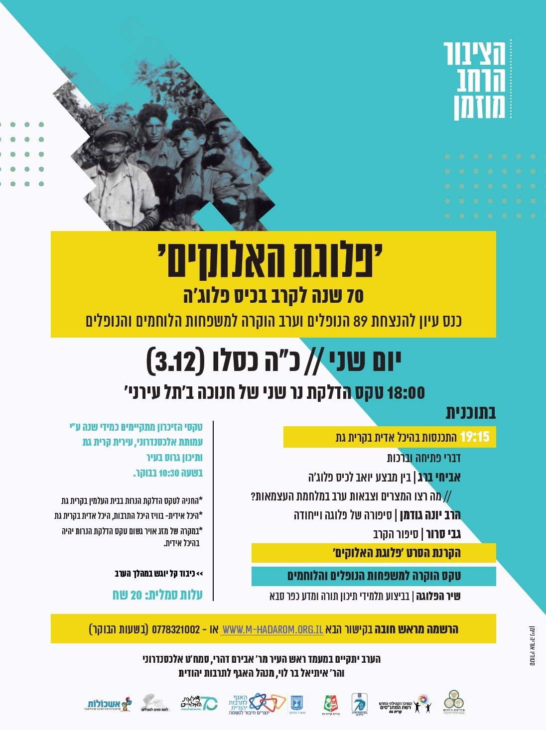 במלאת 70 לנפילת 87 לוחמי קרב כיס פלוג'ה, מוזמנים המשפחות השכולות, צאצאי הלוחמים והציבור, לערב לזכרם.