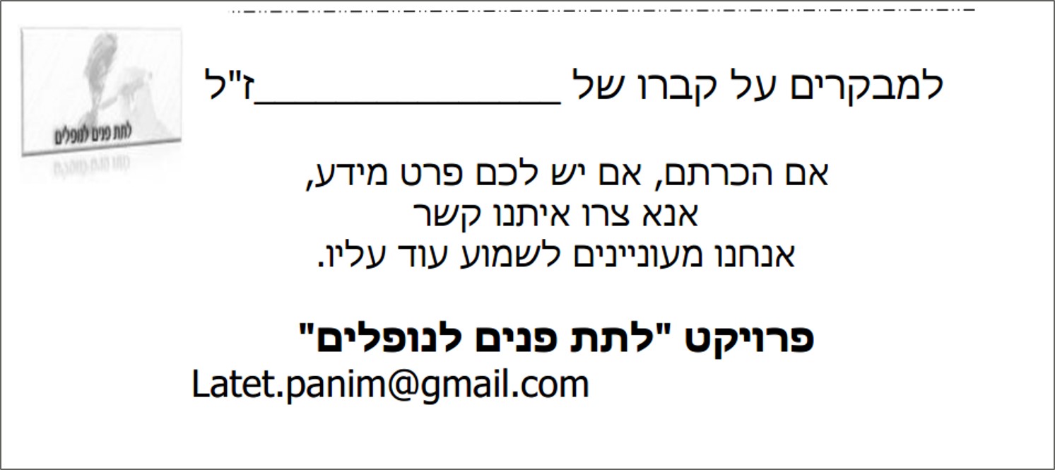 בערב יום הזיכרון וביום הזיכרון עצמו, יפקדו מתנדבים את קברי חללי "לתת פנים לנופלים", אשר נפלו טרם קום המדינה, וסיפורם נותר עלום. המעוניינים, לפקוד קברי הנופלים ולהניח "פתק חיפוש", מוזמנים לפנות בדוא"ל Latet.panim@gmail.com